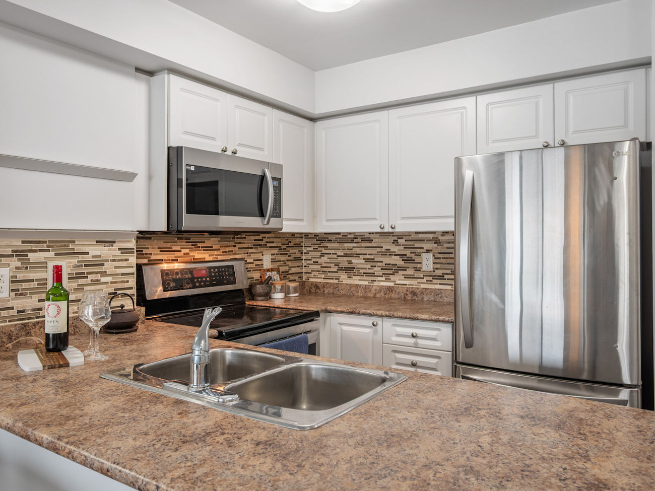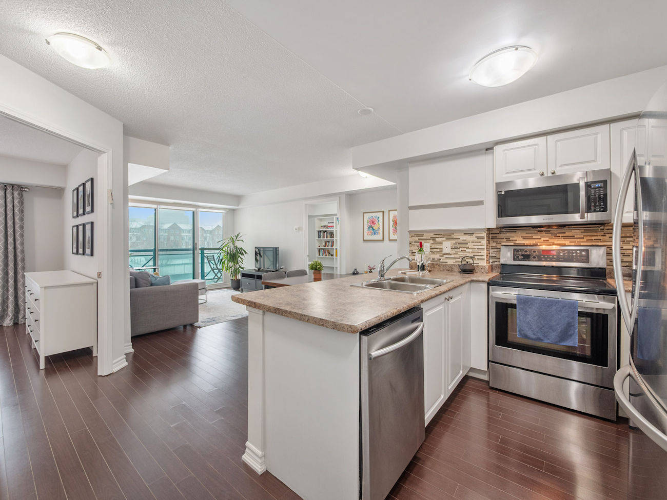 The modern kitchen features stainless steel appliances, a breakfast bar, and clean sightlines into the main living space. From the living area, step out onto the west-facing balcony and enjoy unobstructed city and greenbelt views, providing exceptional privacy, sunset exposure, and abundant natural light throughout the day.