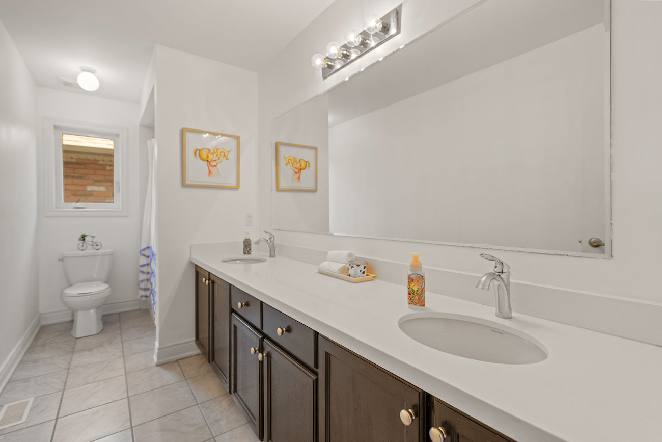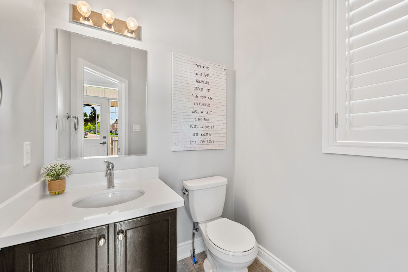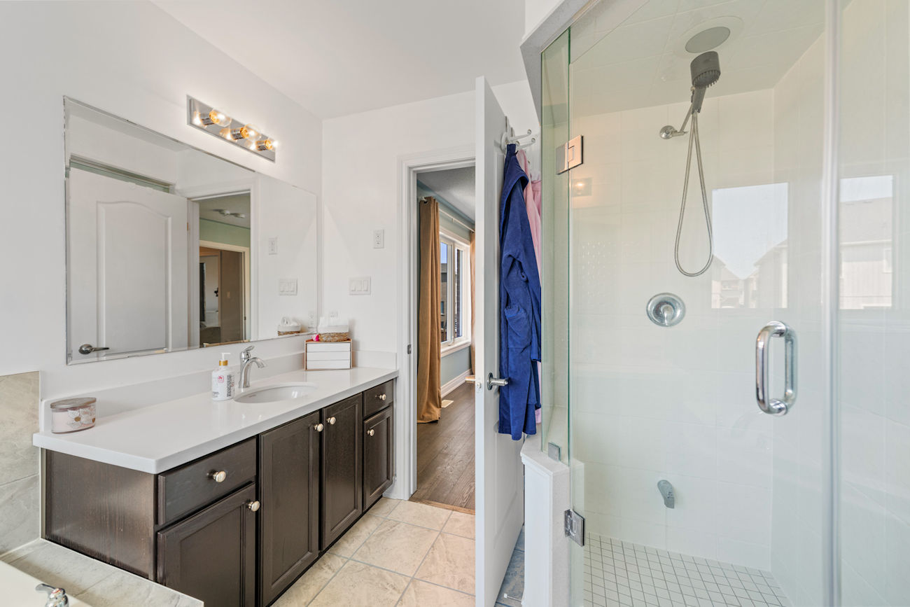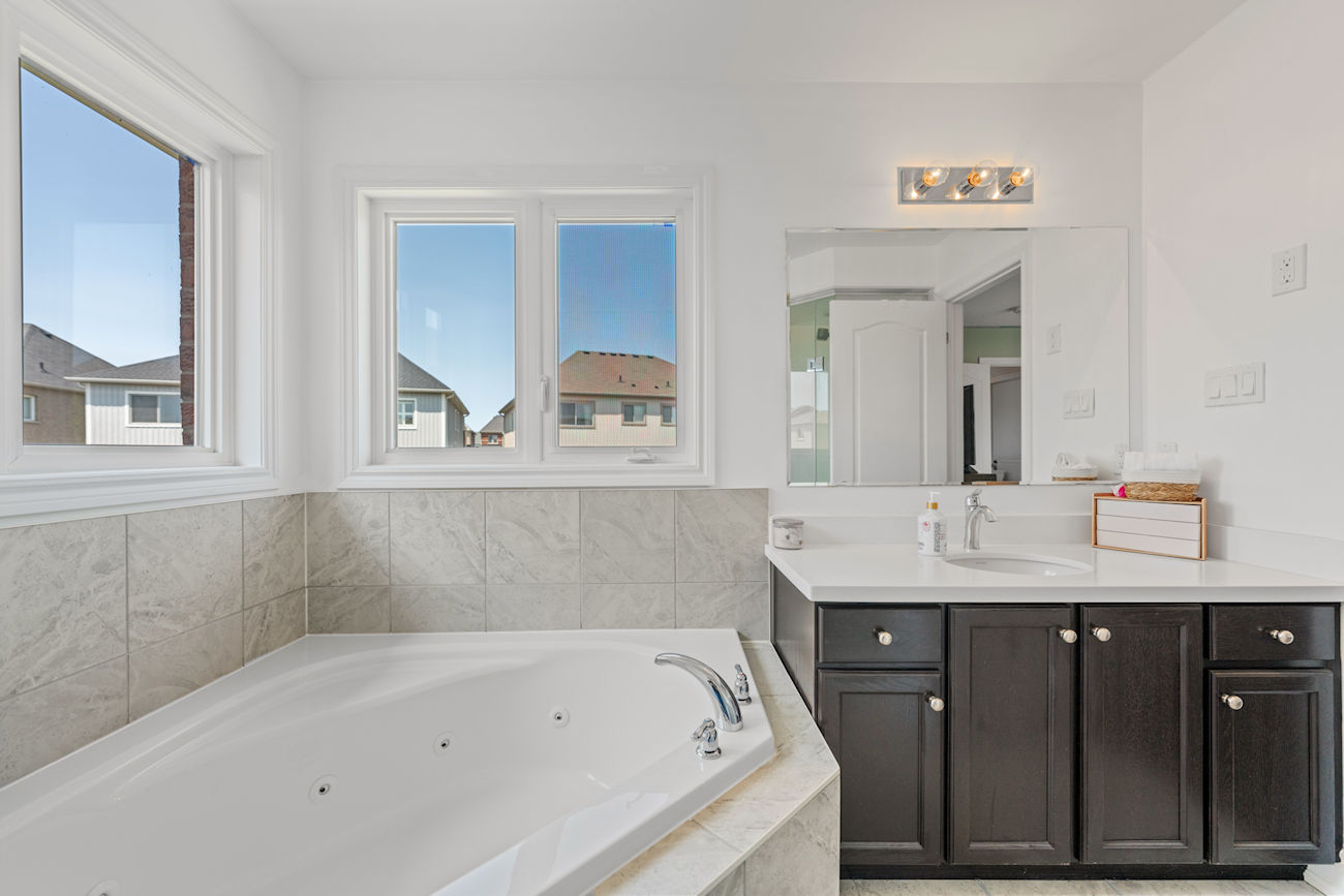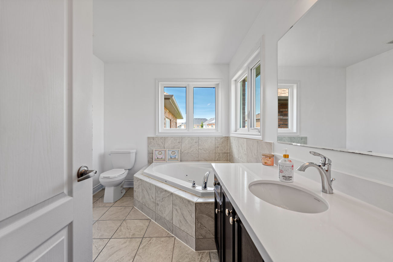 Each bathroom includes upgraded under-mount vanity sinks, Eva granite-finish faucets, and matching quartz countertops. The primary ensuite bathroom offers a seamless glass shower with chrome hinges and a luxurious jacuzzi/whirlpool corner tub. Additional highlights include second-floor laundry, California shutters in two bedrooms, upgraded tile flooring in the foyer, kitchen, powder room, and bathrooms, and a cold storage room under the front porch.