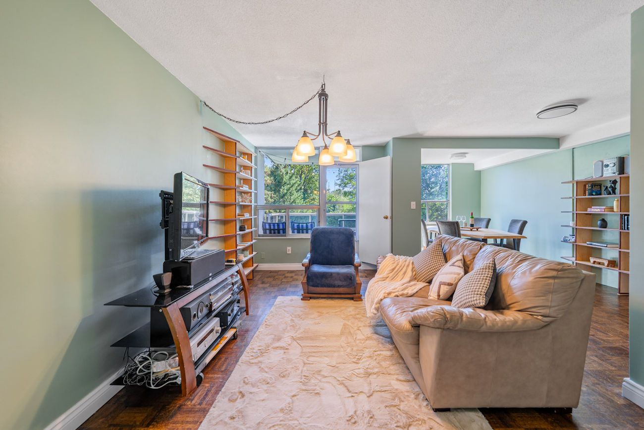 Inside, a bright kitchen with ceramic tile flooring, stainless steel appliances, ample cabinetry, and a tile backsplash opens to the living and dining areas finished with classic parquet floors. Large windows fill the home with natural light and frame leafy, treetop views. Step onto the private balcony with composite decking for morning coffee or sunset unwinding.