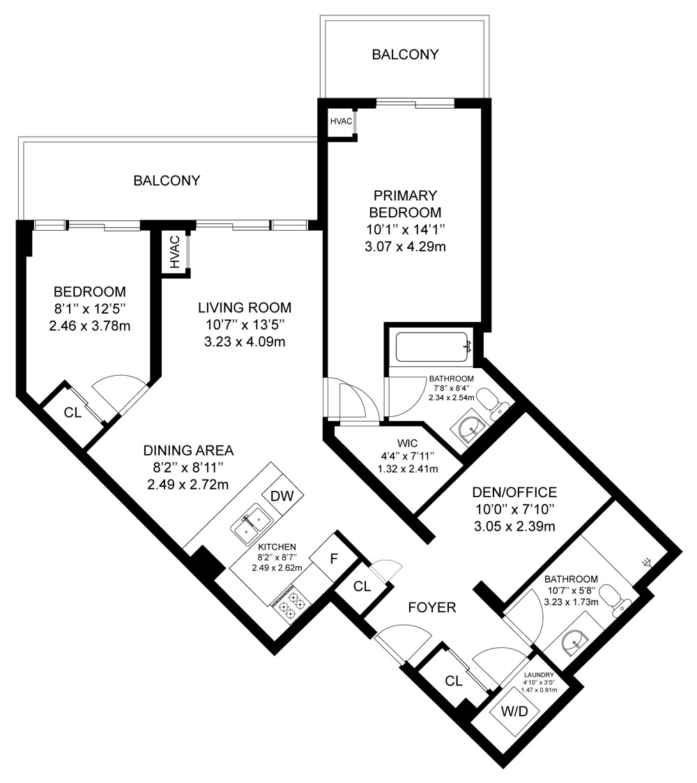The primary bedroom offers a private retreat with a walk-in closet and its own balcony, while the living room and second bedroom share a larger connected outdoor space showcasing panoramic water and city views. The additional den provides flexibility for a home office or guest space, complementing the overall functionality of the suite.