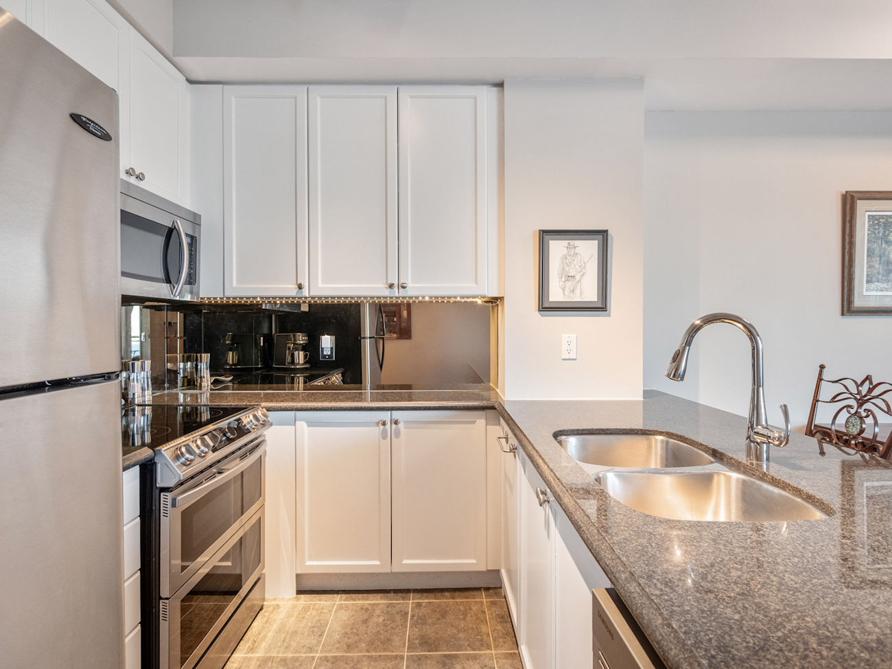 Offering approximately 1,010 square feet of thoughtfully designed living space, this 2 bedroom plus den, 2 bathroom suite is enhanced by engineered hardwood flooring and soaring 9 foot ceilings. The open-concept kitchen features stainless steel appliances, granite countertops, and a functional breakfast bar, seamlessly connecting to the living and dining areas with direct access to the balcony, creating a bright and inviting atmosphere.
