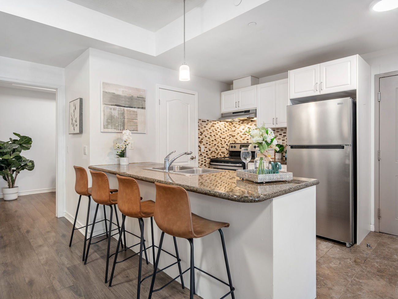 Featuring approximately 1,120 square feet of carpet-free living space, the home showcases a modern open-concept design anchored by a stylish kitchen with granite countertops, stainless steel appliances, and a functional breakfast bar. The kitchen flows seamlessly into the spacious living and dining areas, which are enhanced by custom California window shutters and large east-facing windows that allow for abundant natural light.