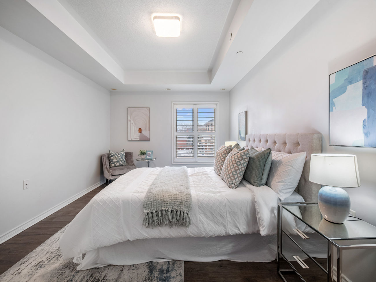 The generous primary bedroom includes a walk-in closet and matching California shutters, while the versatile den, complete with a built-in closet, offers flexibility as a home office or guest space. The upgraded 4-piece bathroom features ceramic flooring and a built-in vanity, complemented by ensuite laundry for added convenience.