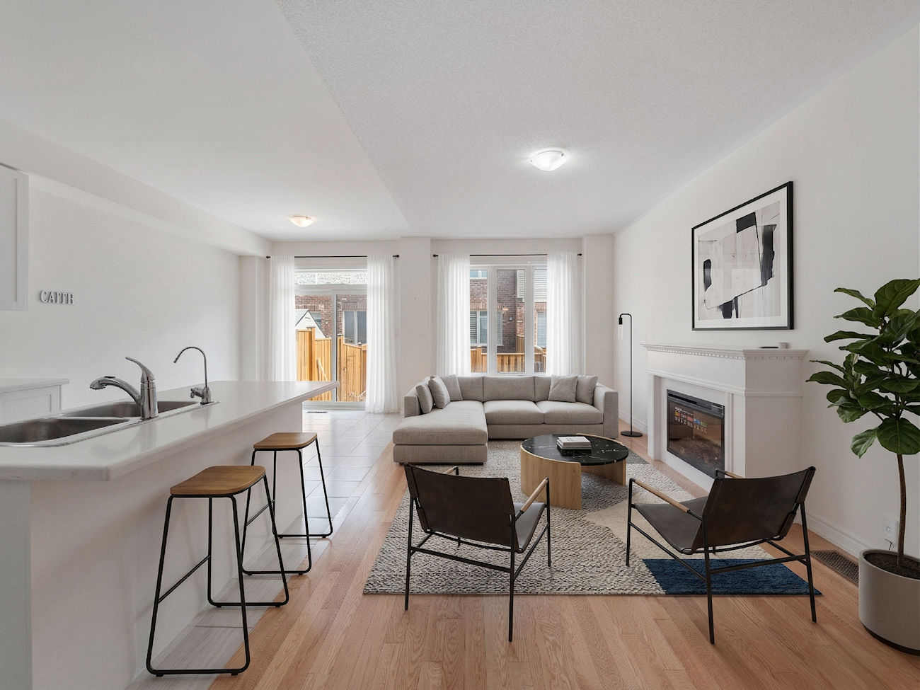 The open-concept living and dining area is enhanced by hardwood flooring and an electric fireplace, creating a warm and inviting atmosphere. A walkout leads to a fully fenced, private backyard, ideal for both entertaining and quiet relaxation.