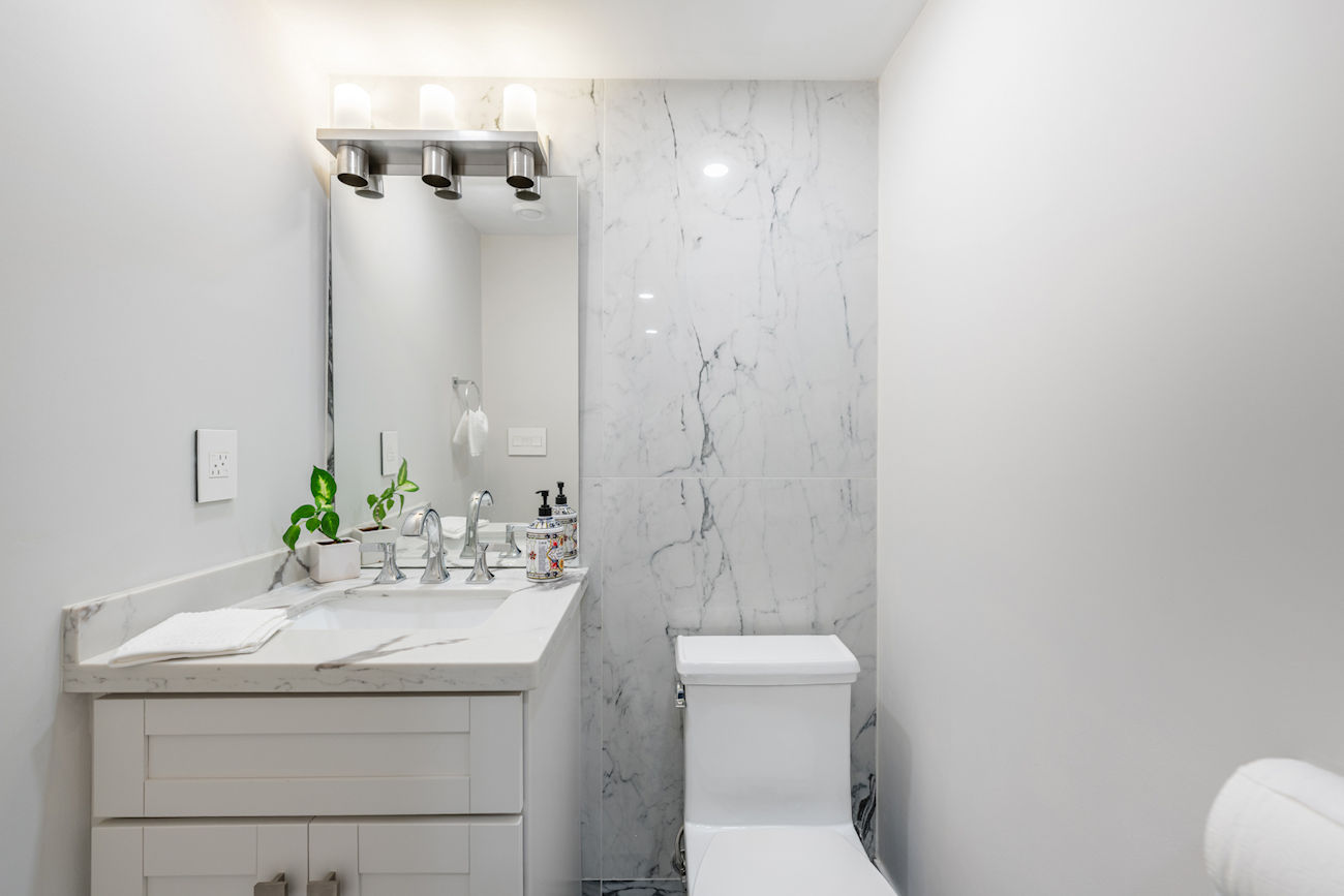 The custom kitchen (2020) anchors the main level with 42″ upper cabinets, quartz countertops, and a generous island with seating and storage. Under-cabinet lighting, pendant fixtures, and Legrand smart switches highlight the space, complemented by premium appliances including a 36″ Bertazzoni dual-fuel range, Bosch refrigerator and dishwasher, and a built-in Panasonic microwave drawer.