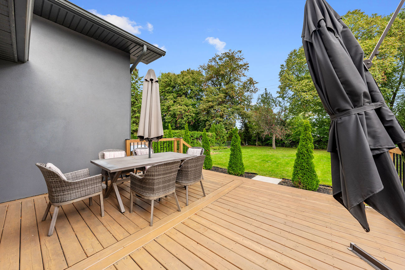 Outside, a treated-pine deck (2020) flows down to a concrete patio and barbecue area surrounded by emerald cedars and perennial gardens, creating a private, tranquil retreat. A five-car driveway and attached two-car garage complete the home.