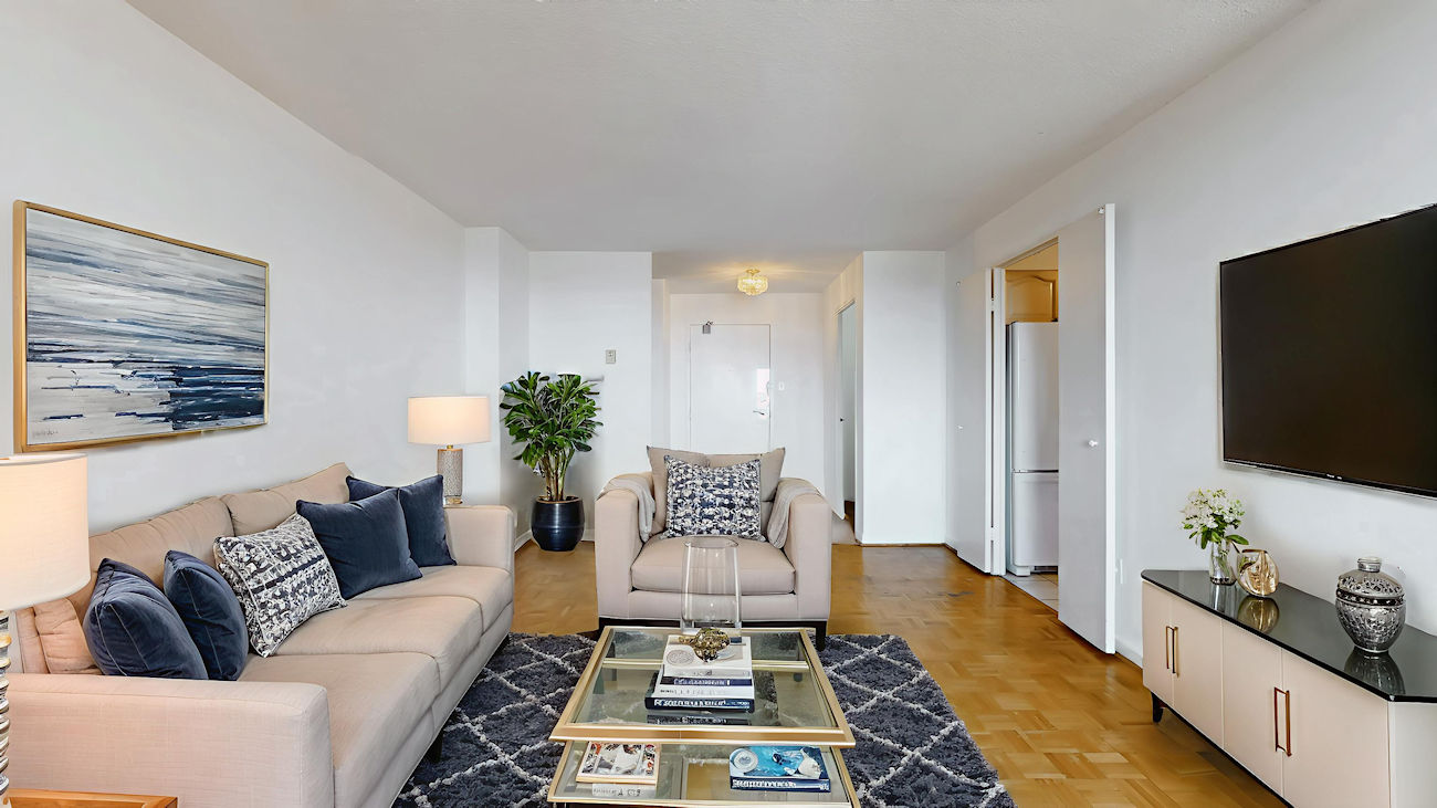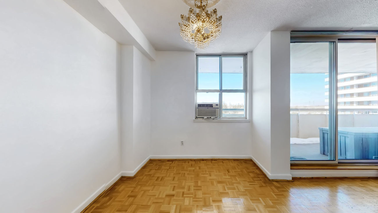 Offering approximately 1,077 square feet of interior living space, the residence has been freshly painted and features a functional, carpet-free layout with parquet flooring throughout. The open-concept living and dining area is well proportioned and extends to an open balcony with northwest-facing views overlooking Thornhill Golf & Country Club, surrounding greenery, and the city skyline.