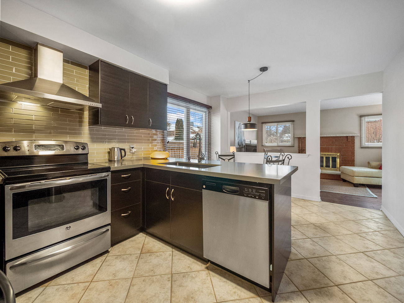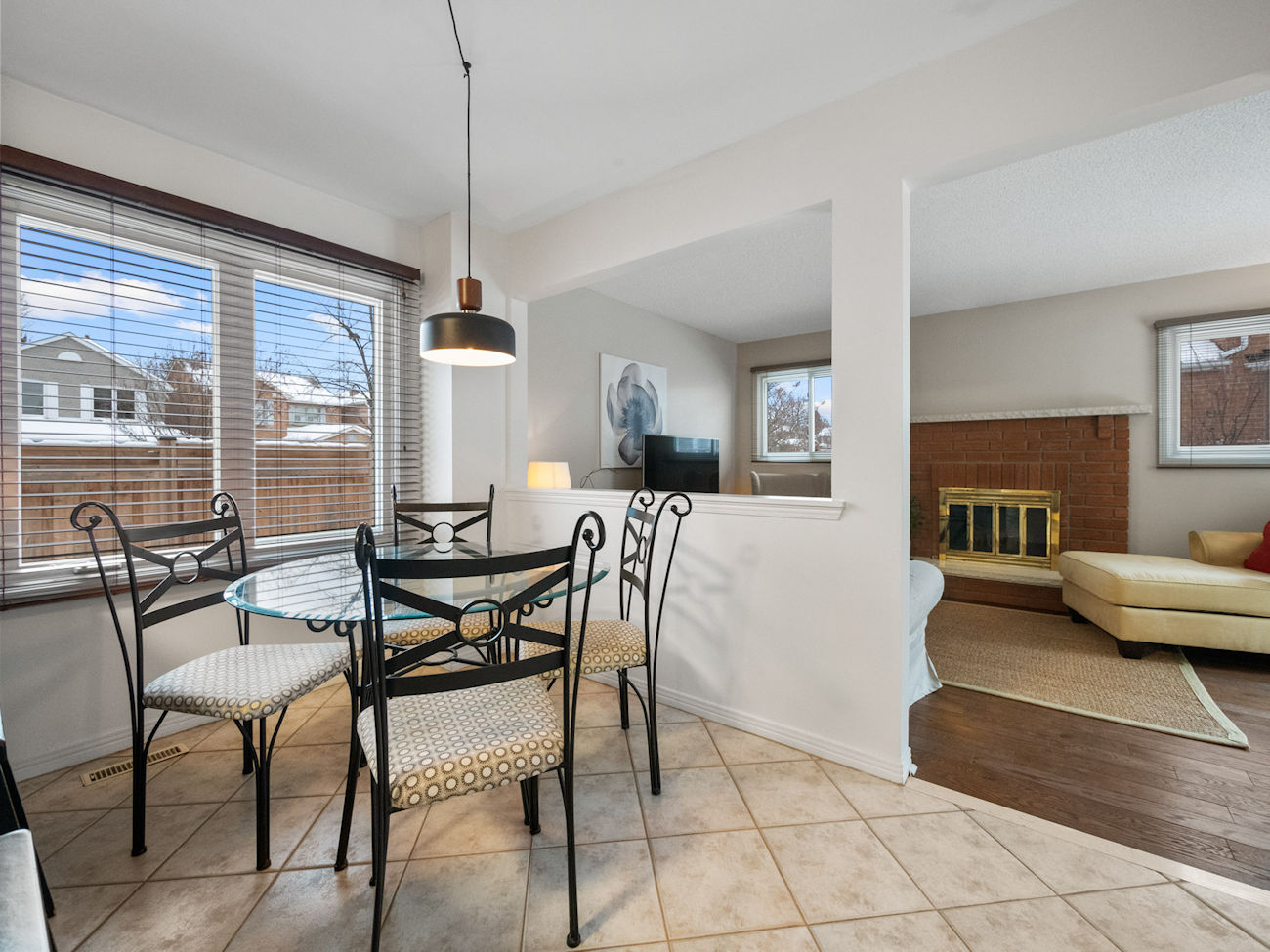 The main floor offers a well-balanced layout with an open-concept living and dining area, ideal for gatherings, along with a warm family room anchored by a wood-burning fireplace and a walk-out to the private backyard. A convenient powder room completes the level.