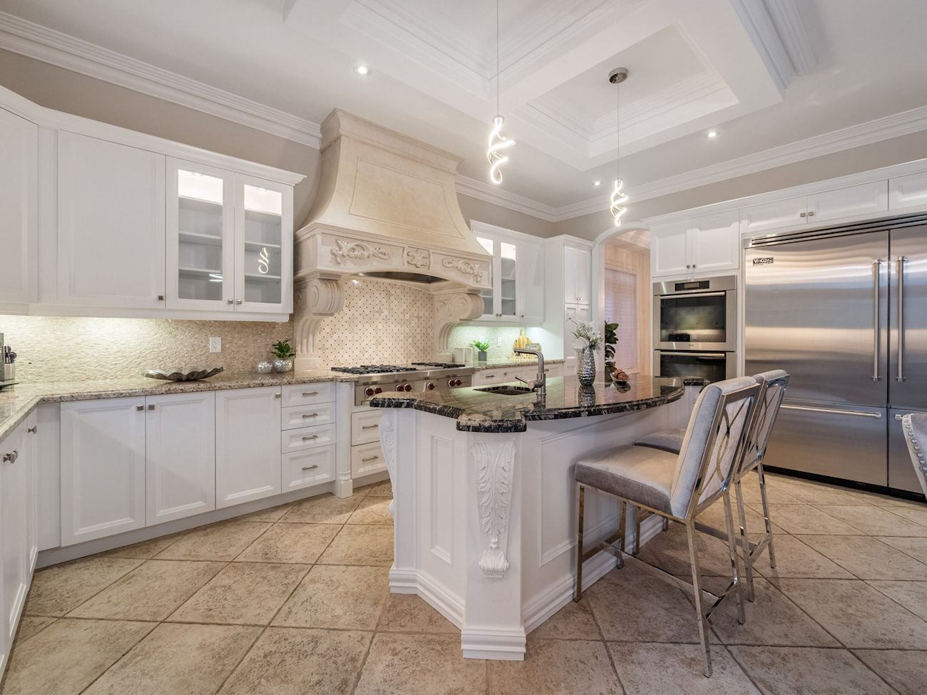 At the heart of the home lies a gourmet kitchen designed for both beauty and performance. Custom cabinetry, stone countertops, and a generous centre island offer the perfect balance of style and functionality. Premium appliances—including dual Viking refrigerators, two Miele wall ovens, and a Wolf six-burner gas cooktop with griddle—make this kitchen a culinary showpiece. Open to the dining and family areas, it’s a space that encourages gathering and connection.