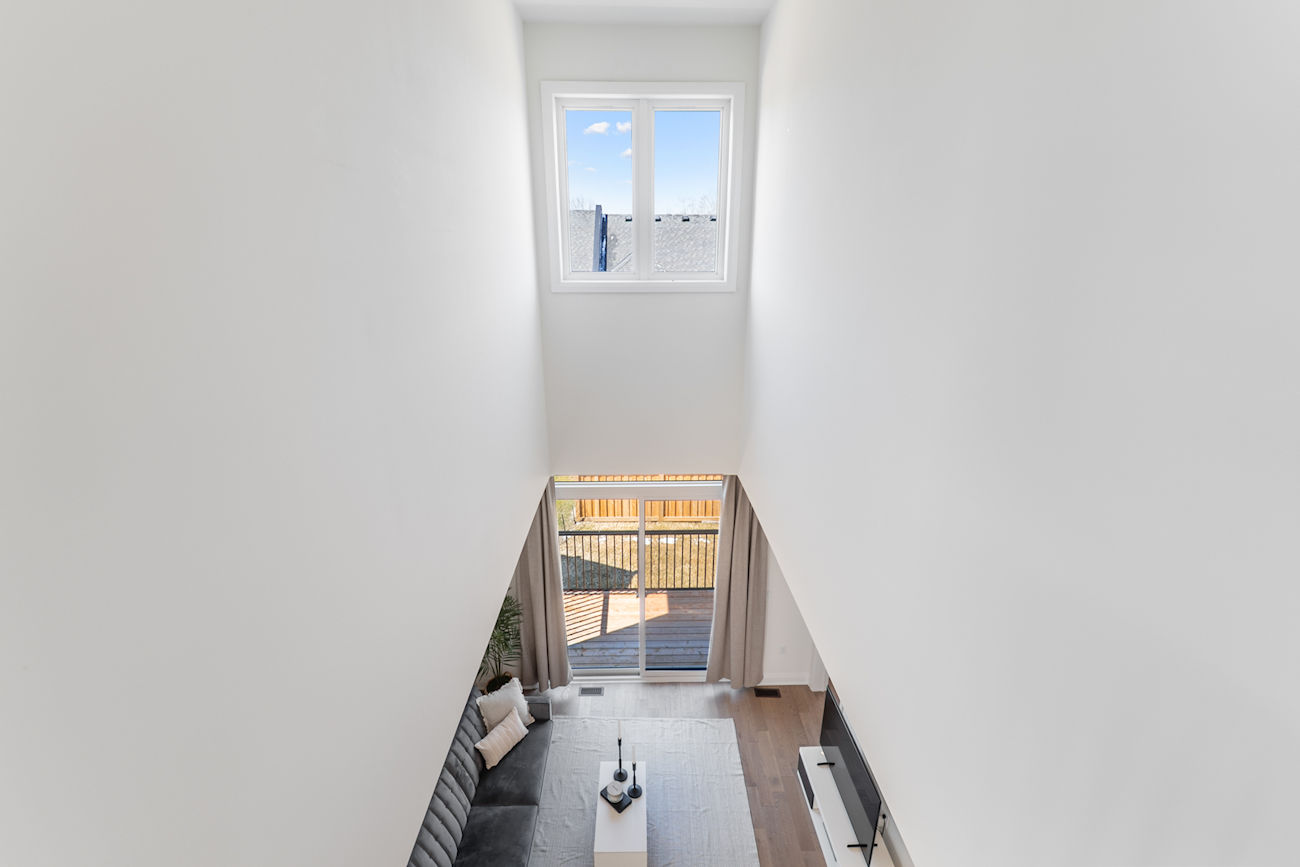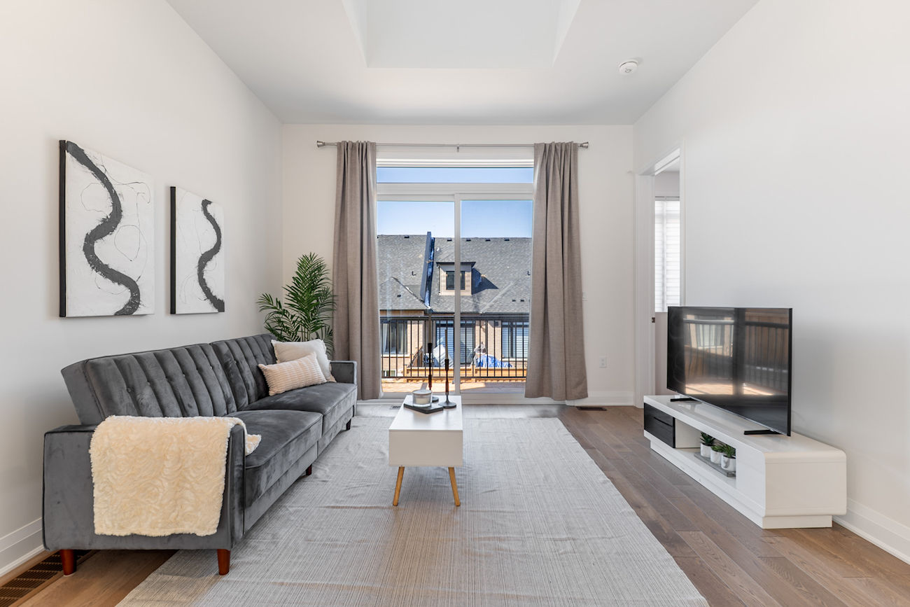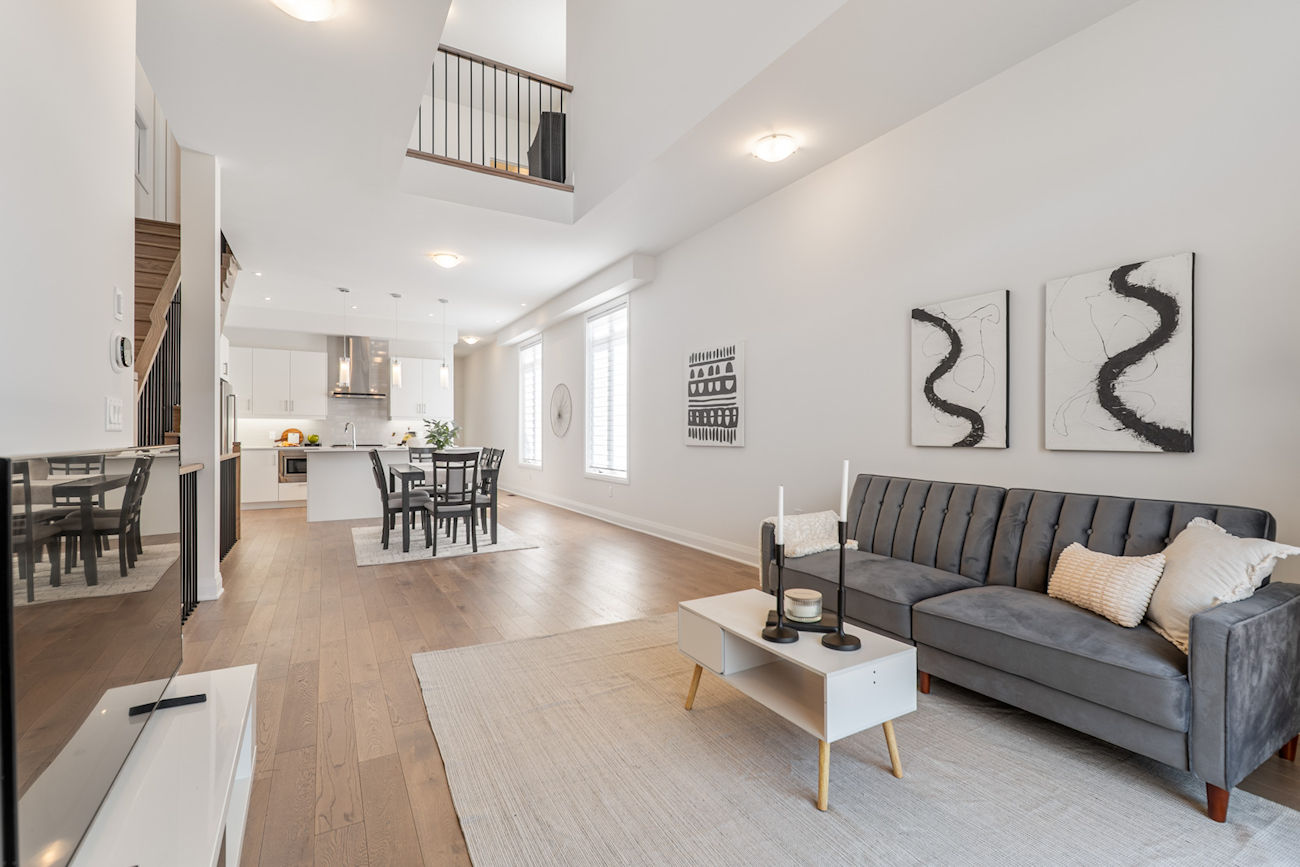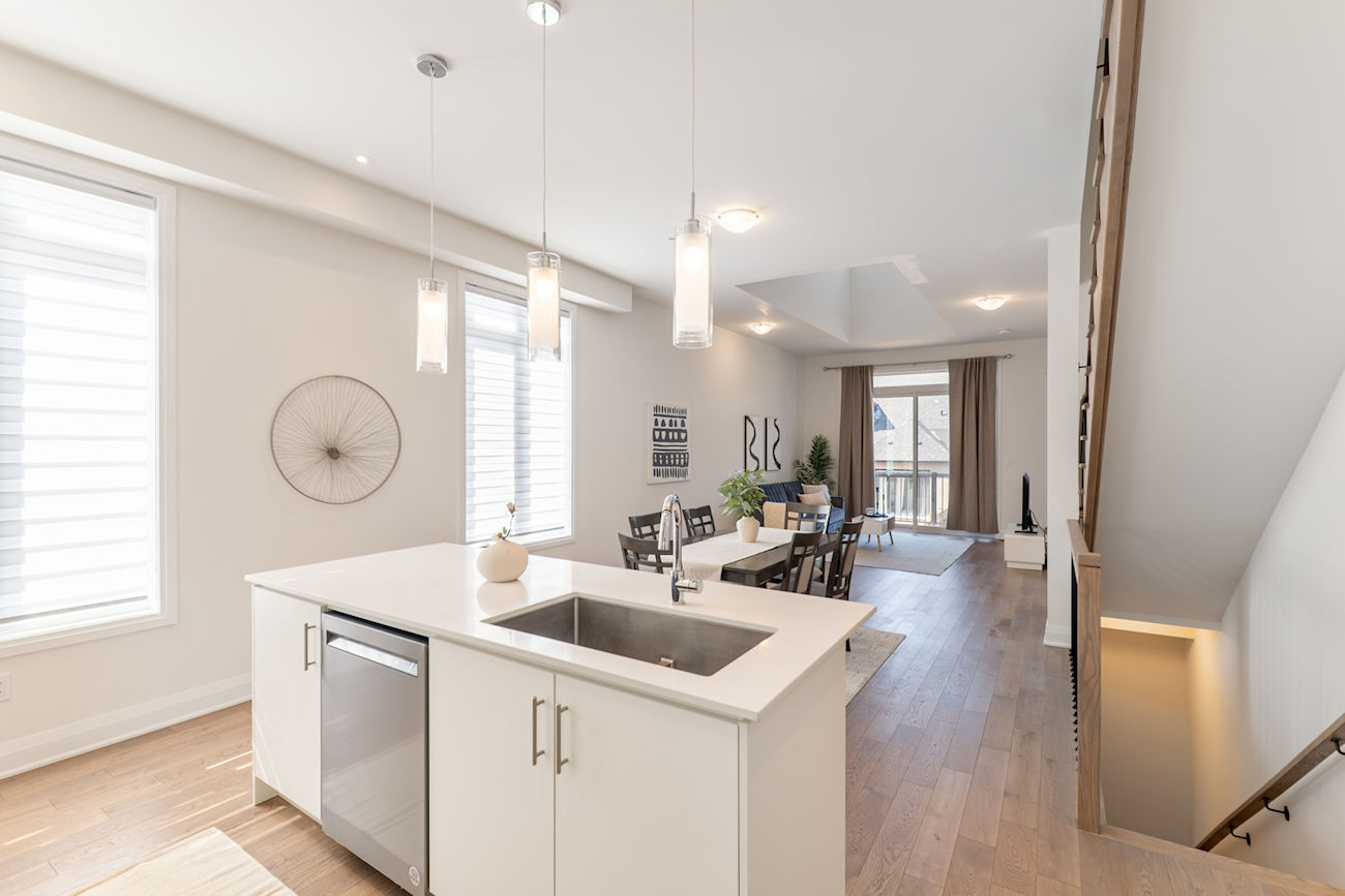 The main level is finished with hardwood flooring and pot lights, anchored by a contemporary kitchen with stainless steel appliances, quartz countertops, and a centre island. The space flows seamlessly into the dining and living areas, with a walkout from the living room to a private balcony, creating an effortless indoor-outdoor connection for relaxing or entertaining. A dedicated laundry room with direct access to the attached garage adds everyday convenience.