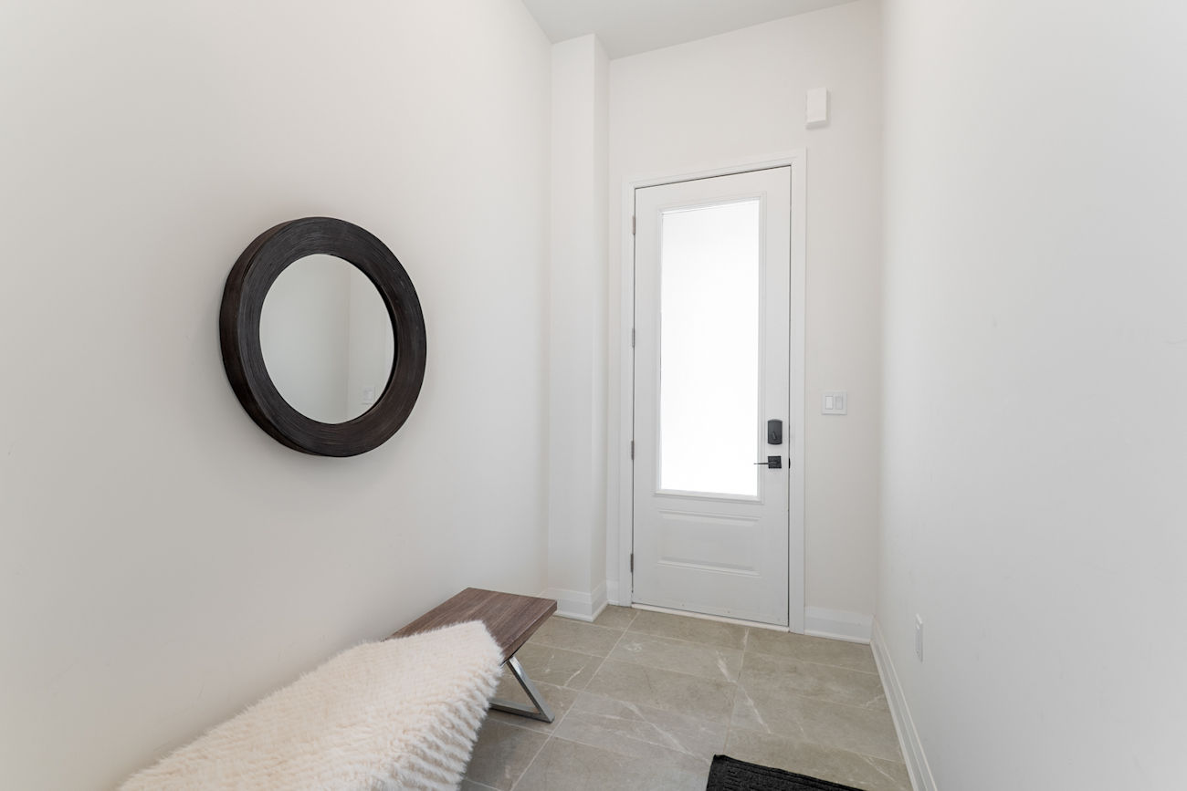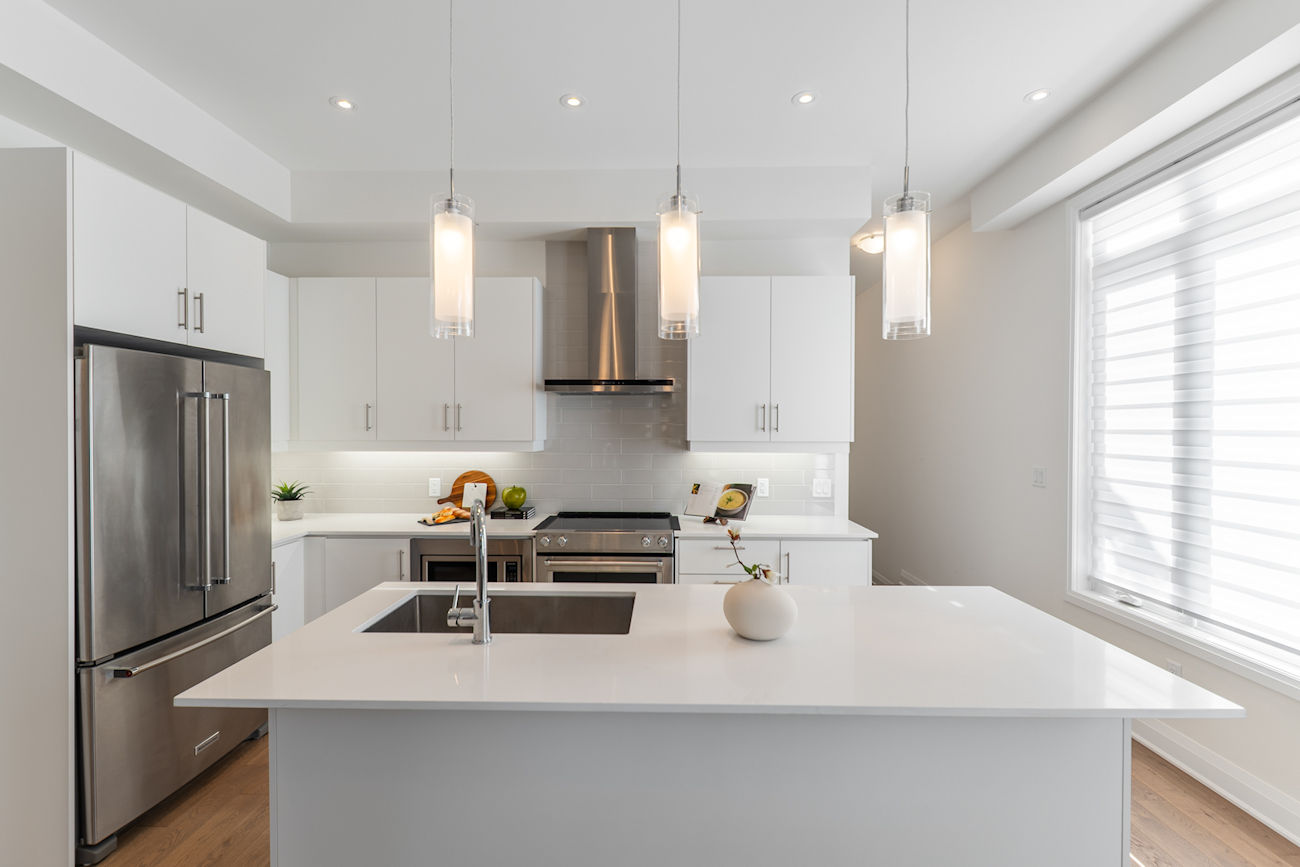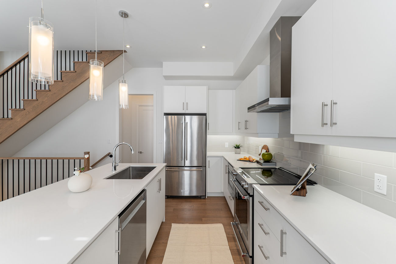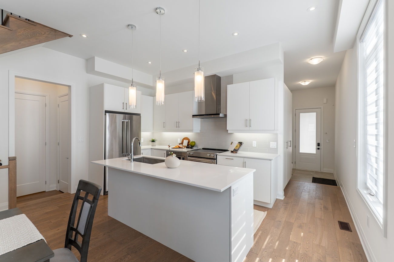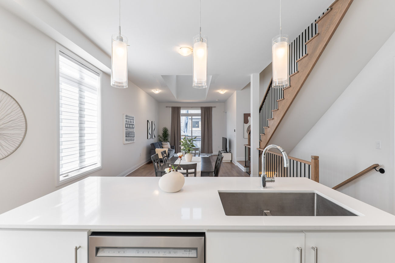 The main level is finished with hardwood flooring and pot lights, anchored by a contemporary kitchen with stainless steel appliances, quartz countertops, and a centre island. The space flows seamlessly into the dining and living areas, with a walkout from the living room to a private balcony, creating an effortless indoor-outdoor connection for relaxing or entertaining. A dedicated laundry room with direct access to the attached garage adds everyday convenience.