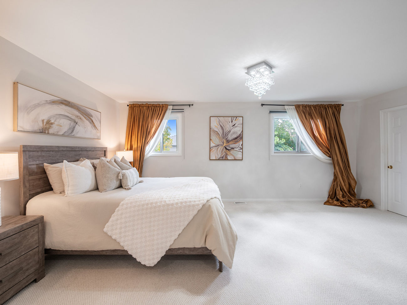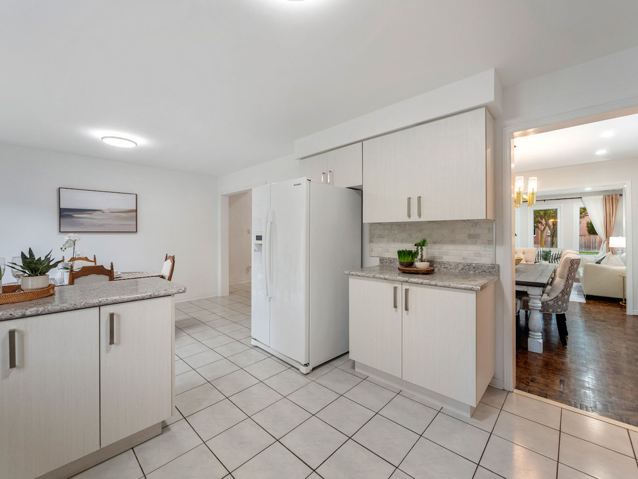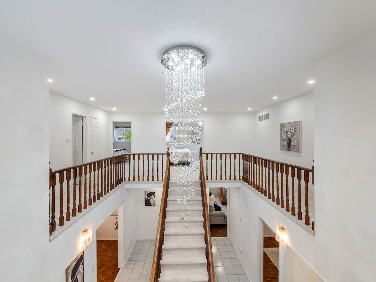 A grand, double-height foyer sets the tone, illuminated by a striking 2023 chandelier and complemented by smooth ceilings and pot lights throughout for a bright, cohesive atmosphere.