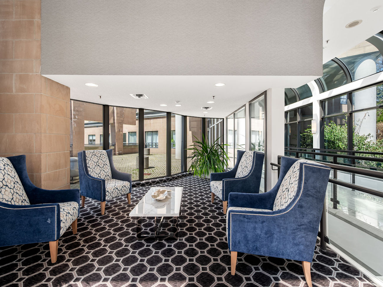 The living room and solarium are wrapped in large windows, filling the space with natural light and showcasing scenic greenery and river views. Maintenance fees include heat, hydro, water, air conditioning, and cable television, adding meaningful convenience and value.