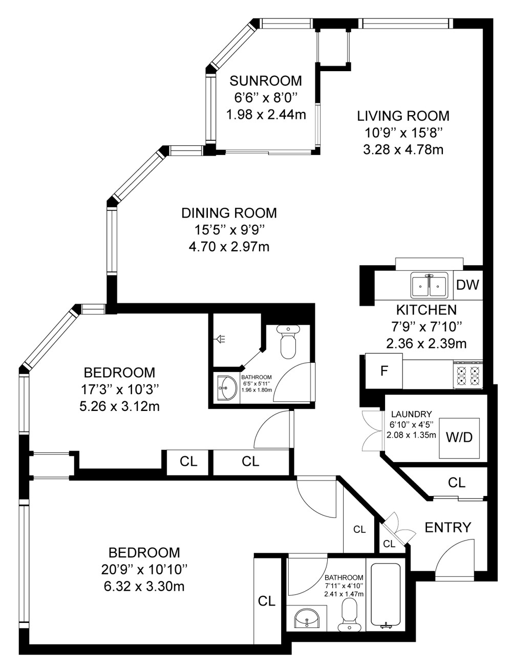 | 8 | Bathroom | Flat | 1.96 x 1.8 | 3 Piece Bathroom, Tile Floor, Built-In Vanity |